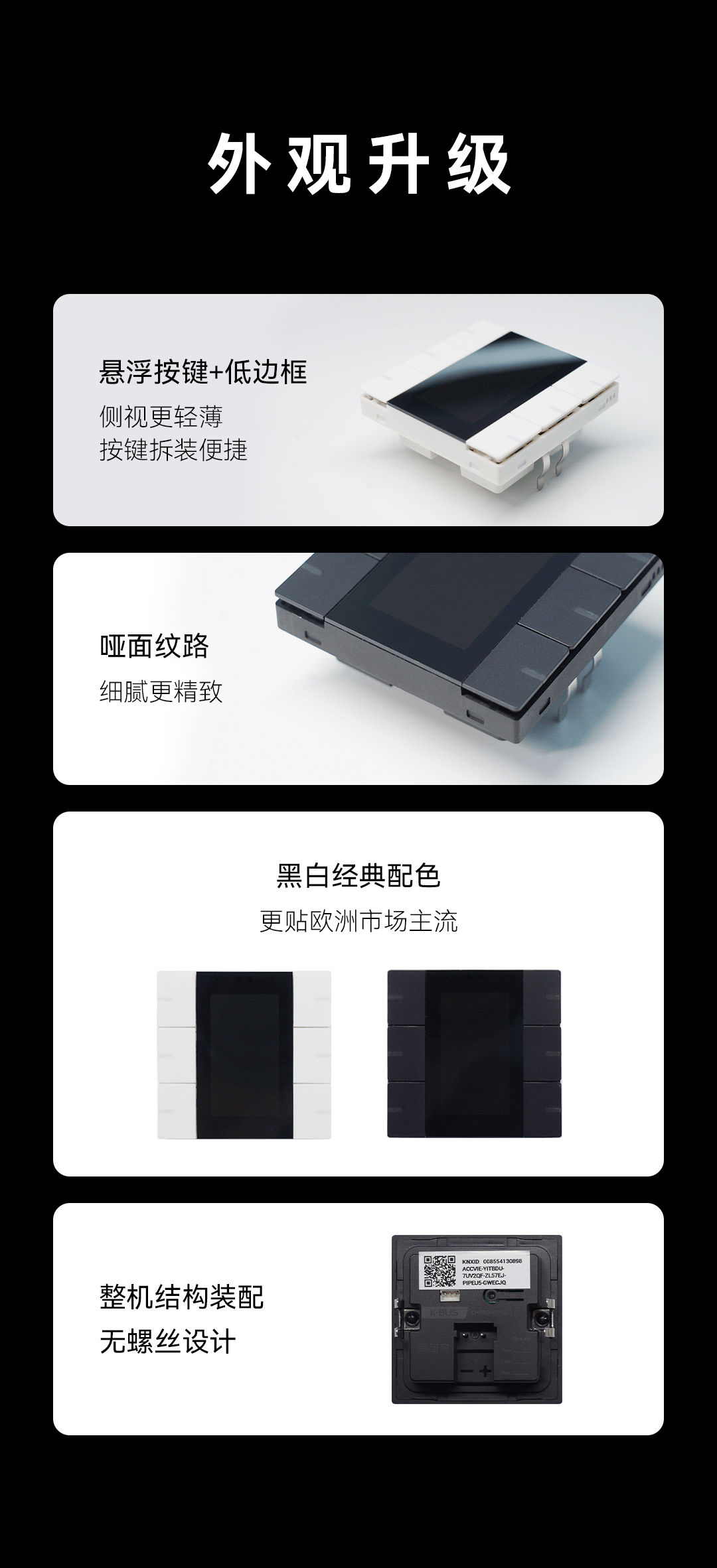 一款專為海外市場及追求高品質(zhì)智能生活的用戶設(shè)計的KNX總線智能面板,向歐洲大牌看齊,用歐洲標準工藝+可視化交互,替代傳統(tǒng)機械開關(guān),顏值高、功能全、適配廣