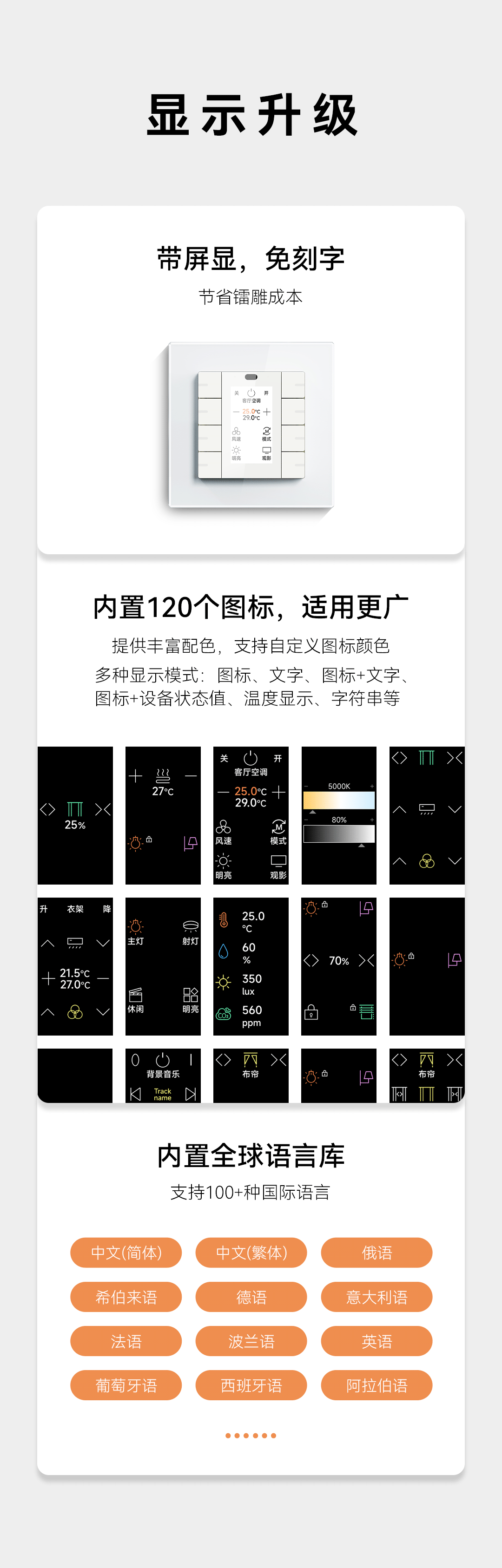 多種顯示模式:圖標、文字、圖標+文字圖標+設(shè)備狀態(tài)值、溫度顯示、字符串等