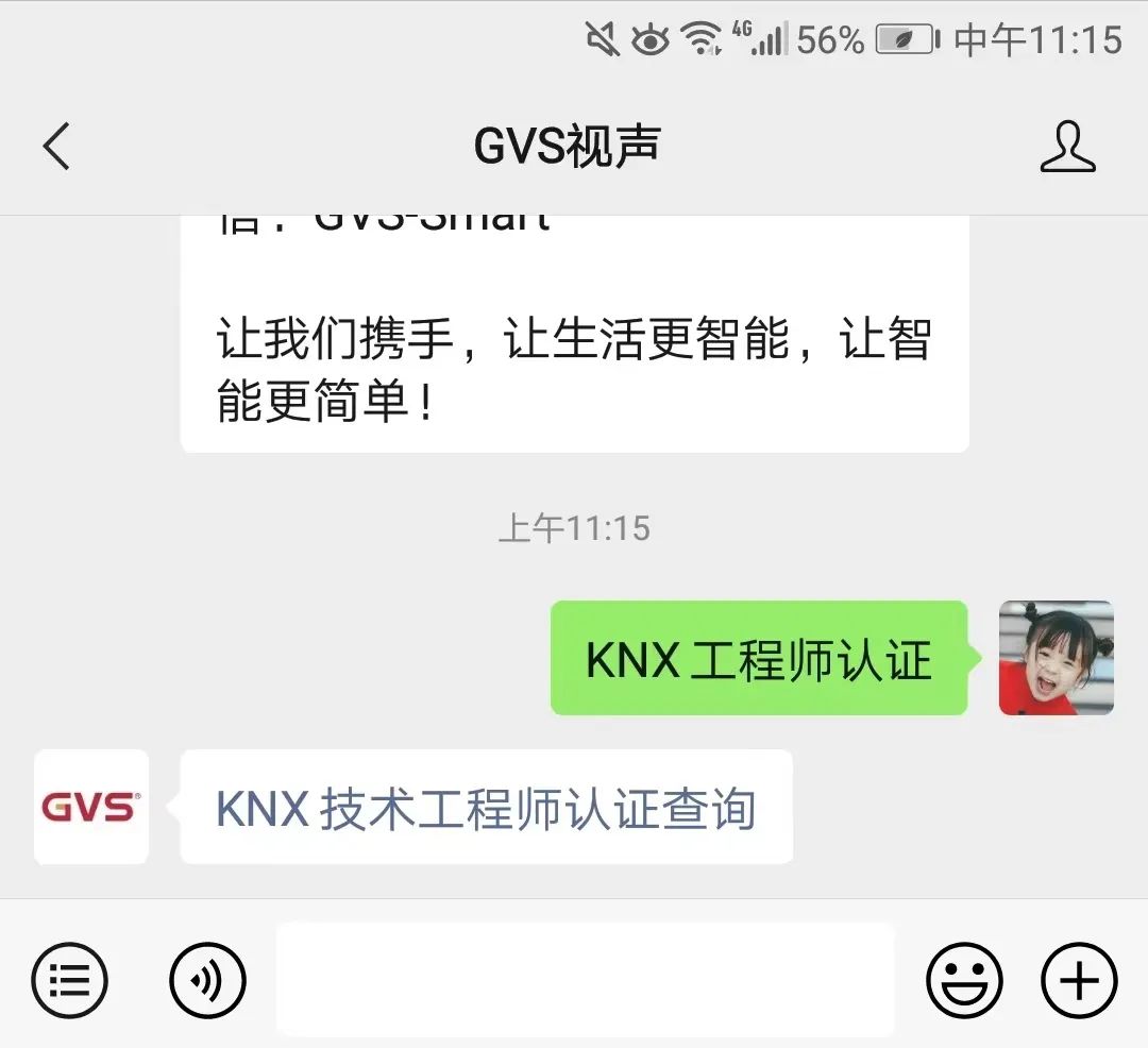 打開公眾號(hào)“GVS視聲”會(huì)話窗口,回復(fù)關(guān)鍵詞“KNX工程師認(rèn)證”,點(diǎn)擊鏈接,輸入姓名/KNX賬號(hào)或證書編號(hào)查詢。