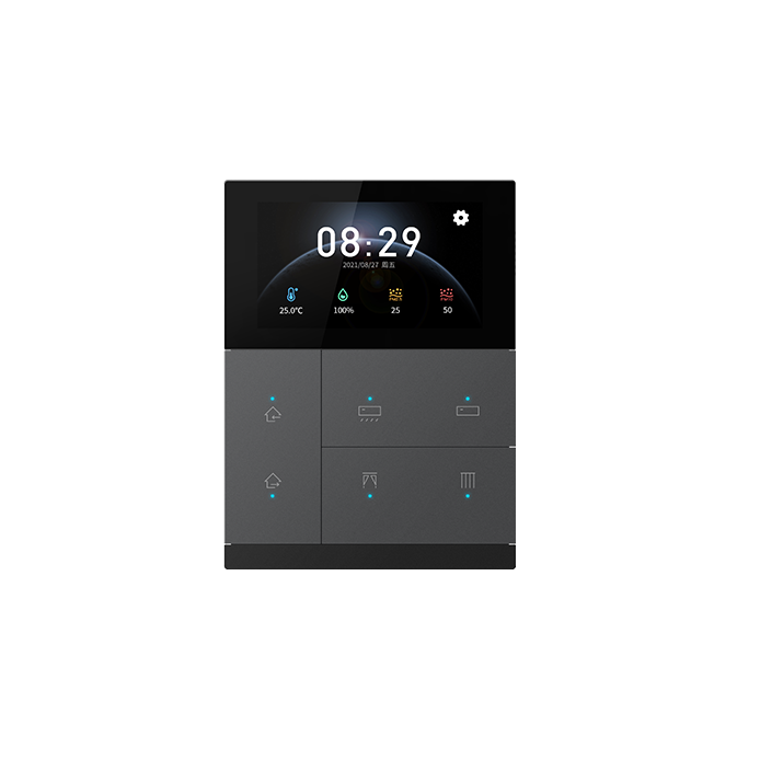 KNX安全3聯(lián)6鍵智能觸摸面板不僅支持屏幕觸控操作,而且支持按鍵操作,帶來雙重體驗(yàn)感的同時(shí),也集成了照明、窗簾、場(chǎng)景、溫控、空調(diào)、新風(fēng)系統(tǒng)、背景音樂、RGB和RGBW調(diào)色、色溫控制等功能,及設(shè)備狀態(tài)顯示,并且內(nèi)置溫度和濕度傳感器,可檢測(cè)本地環(huán)境溫度和濕度,滿足大部分的日常應(yīng)用。