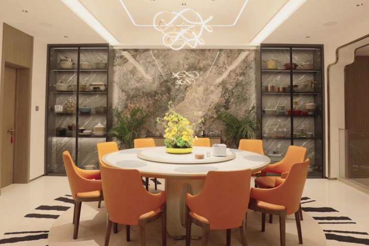 跟隨生活場(chǎng)景隨心調(diào)配燈光,中餐模式、西餐模式、會(huì)客模式、品茗模式......即使是同一個(gè)空間,也能營造出不同的氛圍感貫徹一層負(fù)一層空間的踏步燈帶旋轉(zhuǎn)梯,燈隨人亮,靈動(dòng)智能,上下樓都有了別樣的趣味