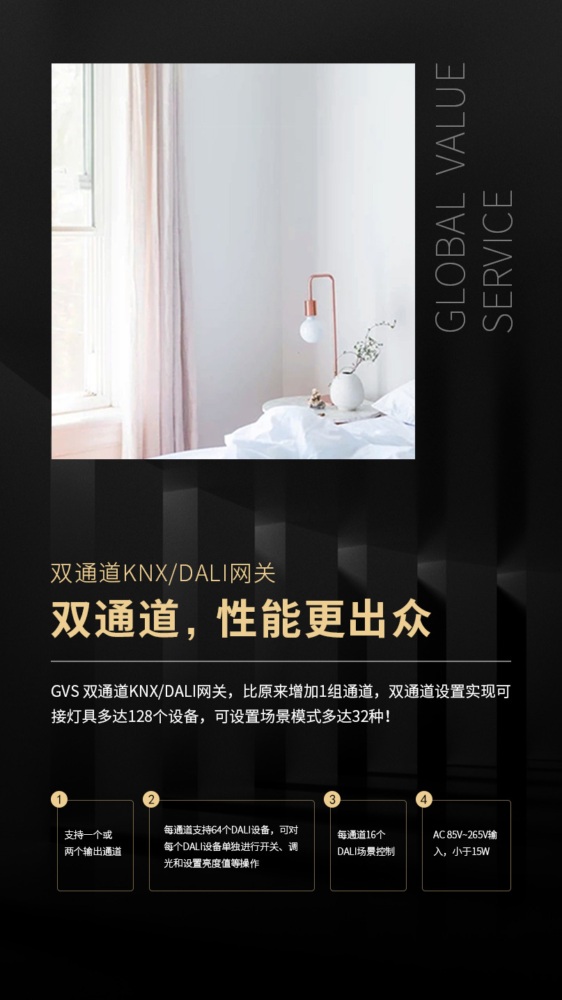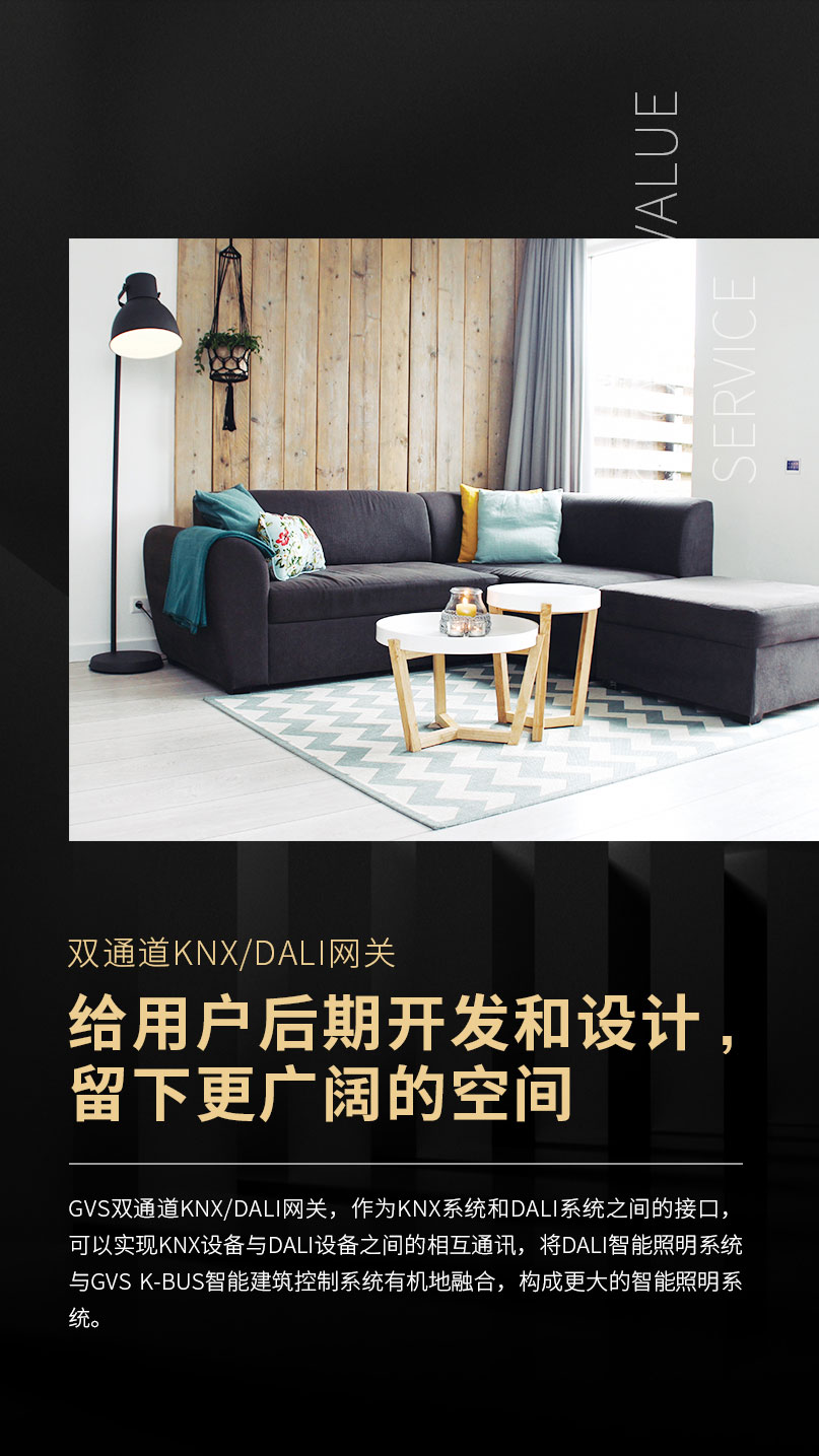 作為KNX領(lǐng)域著名的技術(shù)流派,GVS為市場(chǎng)提供KNX/DALI網(wǎng)關(guān)系列產(chǎn)品。平滑舒適的調(diào)光、調(diào)色溫、調(diào)亮度等燈光效果,為設(shè)計(jì)師的開發(fā)與燈光設(shè)計(jì)留下了廣闊的空間。