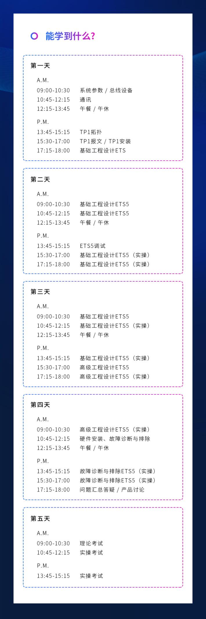 理論+實(shí)操,為期5天的培訓(xùn)內(nèi)容詳實(shí)豐富,必定讓你對KNX應(yīng)用技術(shù)有一個(gè)全面而深入的了解,你甚至或許能以專業(yè)客觀的角度對KNX設(shè)計(jì)方案的整體質(zhì)量作出評價(jià)。