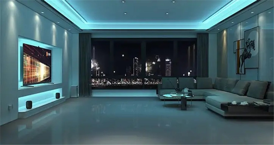 如果想在家欣賞大片的話,則開啟“觀影模式”,那么背景燈自動調(diào)節(jié)到觀影氛圍,客廳其他燈光慢慢暗下來,打造恰到好處的燈光氛圍,身臨其境的觀影體驗(yàn),電視自動打開,開始觀看影片。